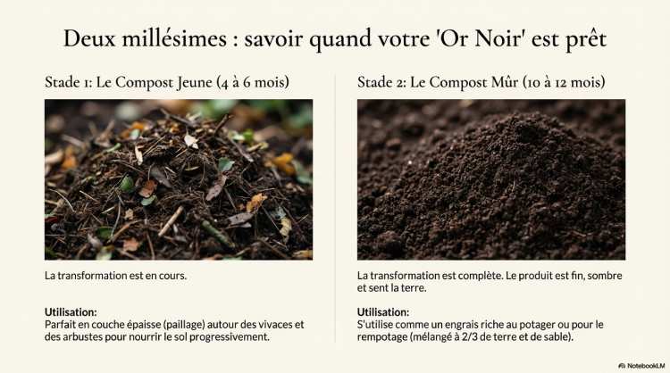 Le produit final évolue en deux stades : un compost « jeune » (4 à 6 mois), utilisable en paillage, et un compost « mûr » (10 à 12 mois), qui sert d’engrais puissant pour le potager ou d’amendement pour les rempotages.