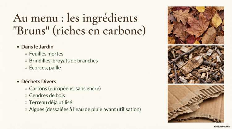 | Déchets Bruns | Carbone (C) | Feuilles sèches, brindilles, branches mortes, écorces, paille. |